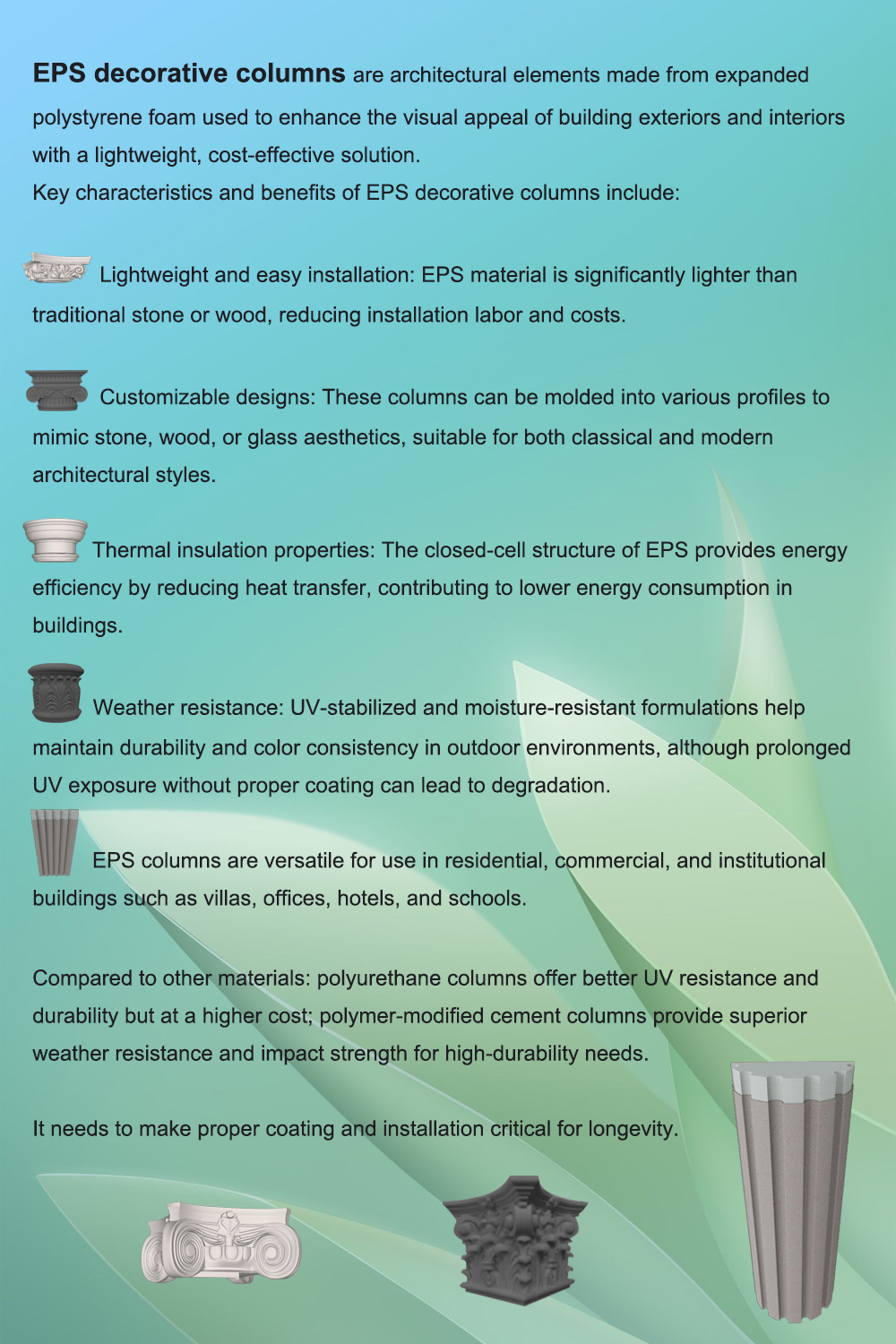 EPS decorative column head and base are exterior wall decorative components made of lightweight foam material, which enhance the building’s aesthetics and are easy to install.