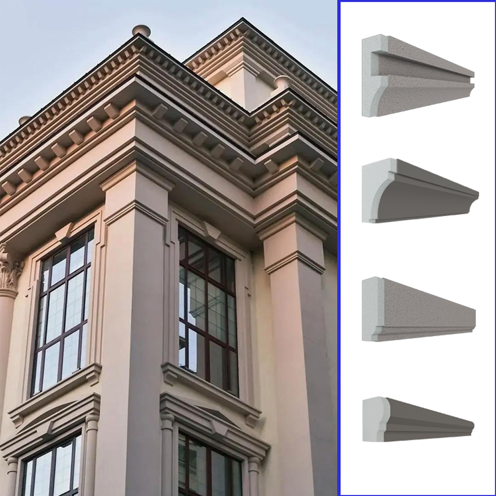 EPS decorative mouldings are fireproof and do not emit toxic substances, making them an environmentally friendly and high-quality decorative building material. They are a new type of exterior wall decorative line and component, more suitable for installation. On exterior walls insulated with EPS or XPS, they can showcase a classic and elegant European decorative style while ensuring that the main building’s exterior walls do not experience thermal bridging. They offer advantages such as convenient installation, economy, and long durability.